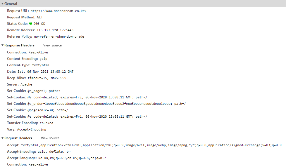 - Keep-Alive: timeout=15, max=9999 → 연결 유지를 기본 15초이며, 연결 최대 횟수를 9999회로 정의