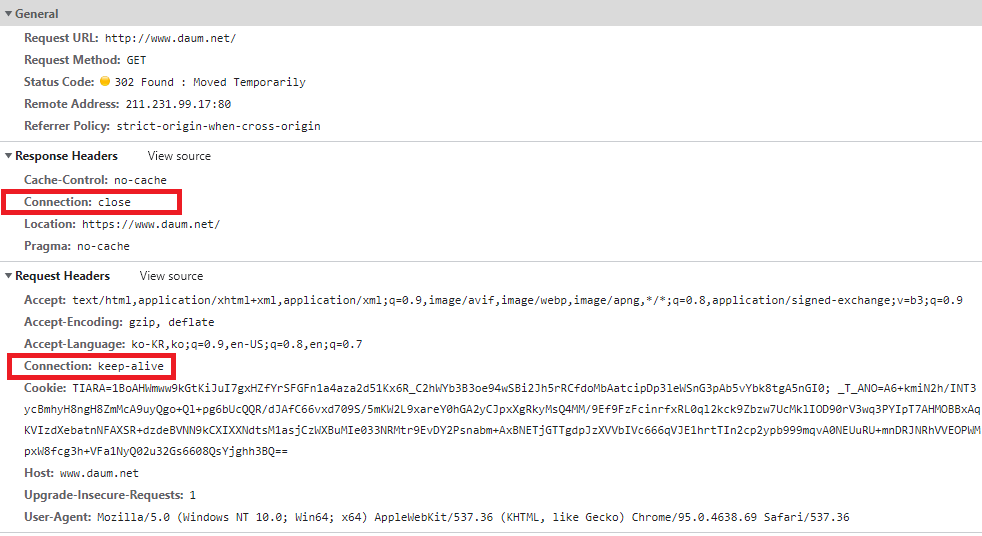 다음(www.daum.net) 메인 페이지를 접속한 헤더 정보