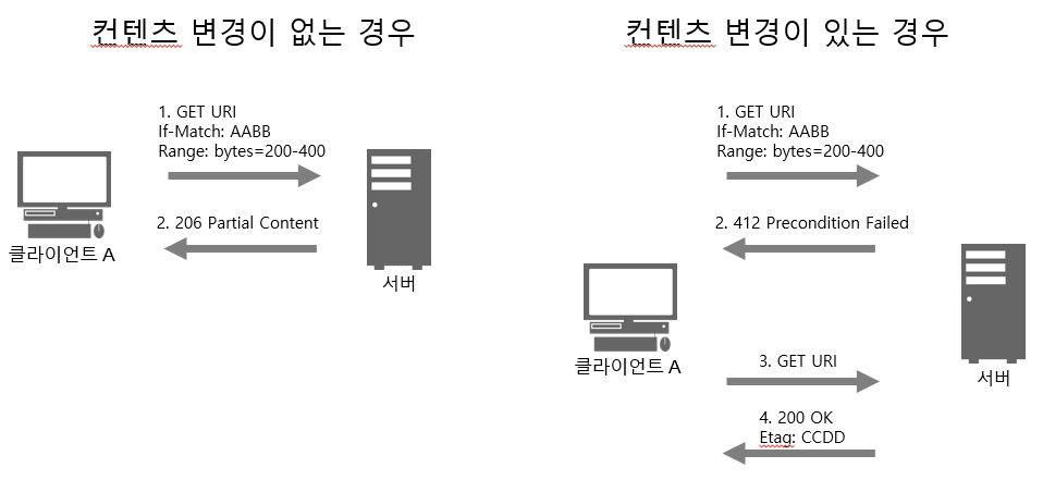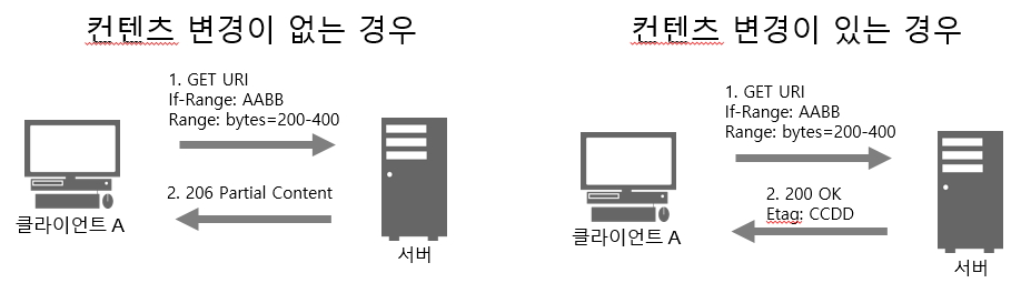 - 웹서버는 If-Range 헤더를 받게 되면, 컨텐츠가 변경된 경우는 새로운 컨텐츠 전체를 전달