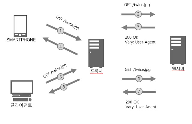 최초 모바일로 트와이스 이미지를 요청하여 전달받게 되면 캐싱된 트와이스 이미지는 모바일 User-Agent 값인 경우에만 직접 전달 가능 ->데스크톱에서는 캐싱된 트와이스 이미지를 사용 불가
