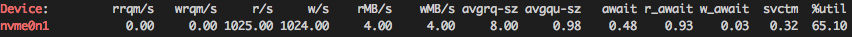 - %util 지표 외에 await과 read/write throughput(xx MB/s) 지표와, nand 제품의 성능 한계치(별도의 부하 테스트나 제품 공식 성능 자료 참고)와 비교하며 모니터링에 참고
