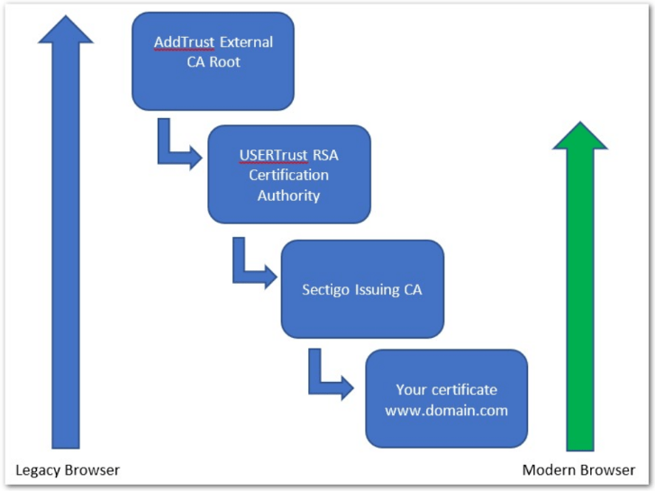 모던 브라우저와 레거시 브라우저의 인증서 체인 차이(출처: Sectigo 공식 문서)