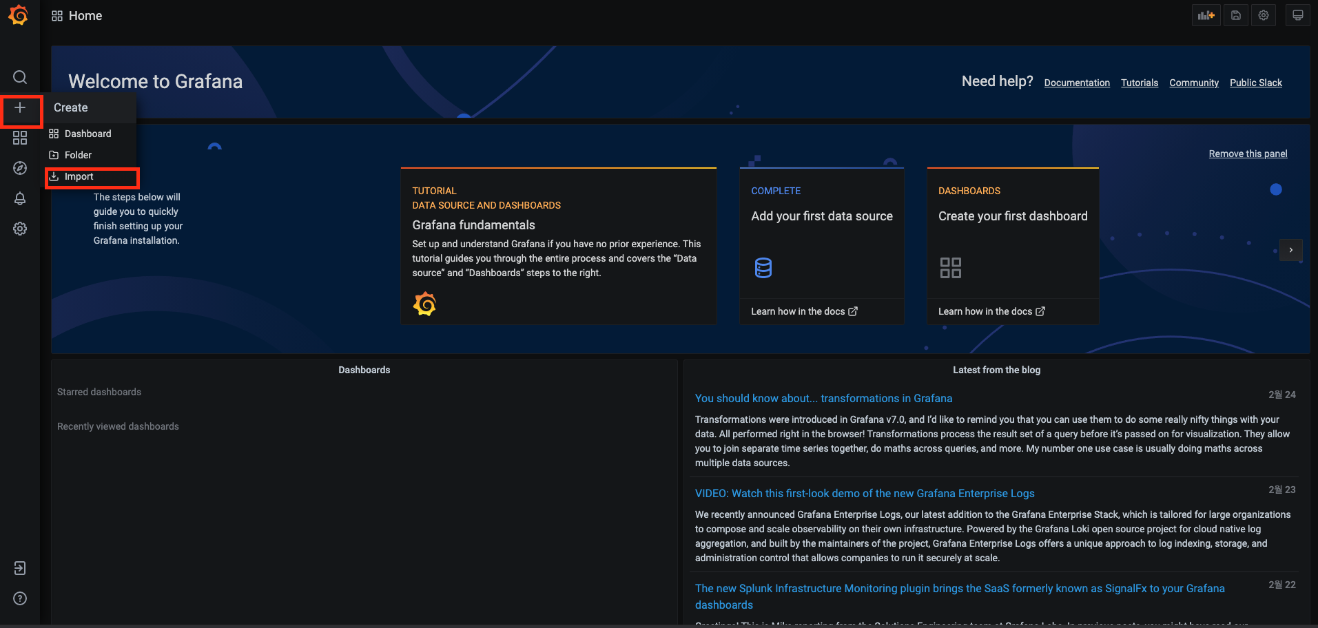 2. 그라파나 대시보드로 이동한 후, 왼쪽 탭의 두 번째 "+"의 "Import" 메뉴를 클릭