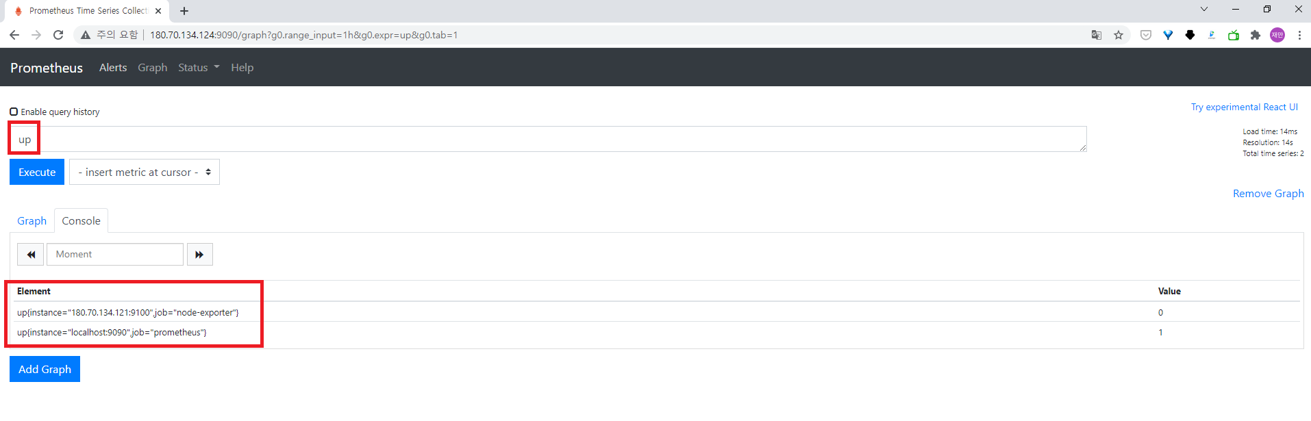 Prometheus UI에서 다음 쿼리를 입력 → node-exporter 설치한 서버의 값 읽음