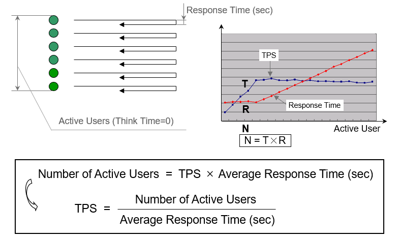 - 1명의 사용자가 시스템에 요청을 보낼 때 응답이 1초에 처리 → 초당 처리건수(TPS)는 1건