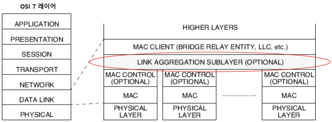 - 링크 어그리게이션 서브레이어(Link Aggregation Sublayer)는 LLC 계층과 MAC 계층 사이에 위치함