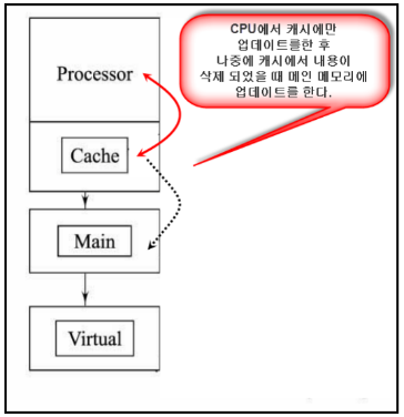 - 데이터를 쓸 때 메모리에는 쓰지 않고 캐시에만 업데이트를 하다가 필요할 때에만 주기억장치나 보조기억장치에 기록하는 방법