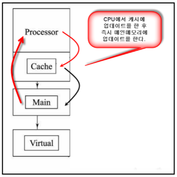 - 속도가 빠른 대신에 캐시에 업데이트 하고 메모리에는 바로 업데이트를 하지 않기 때문에 캐시와 메모리가 서로 값이 다른 경우가 발생 가능