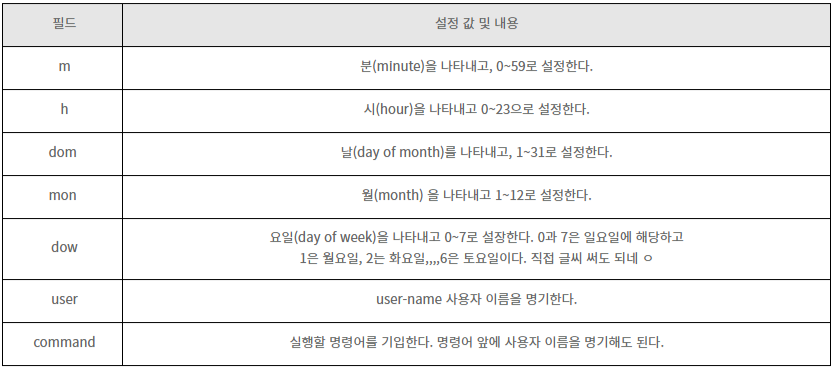 crontab 설정 형식(crontab 파일의 7 필드)