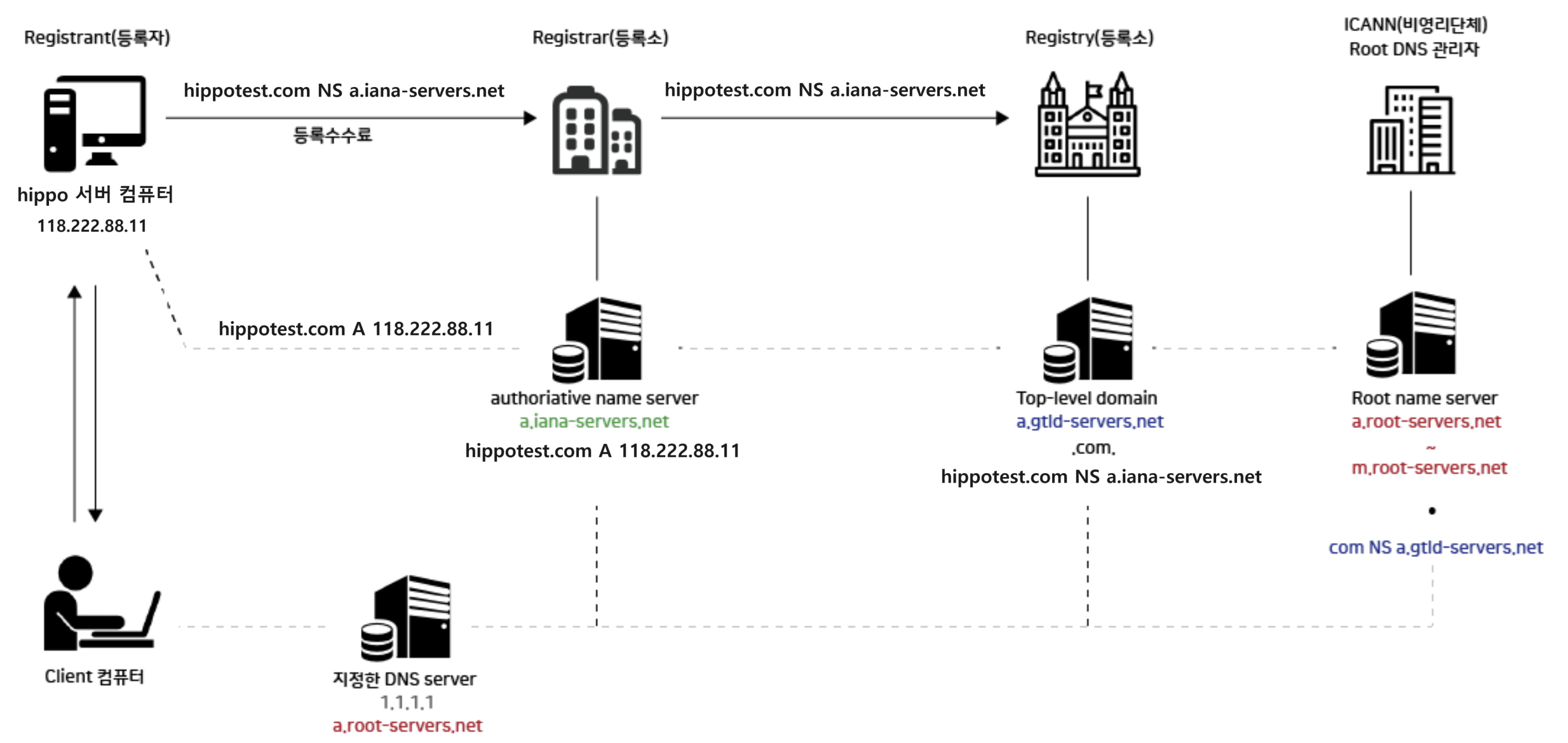 - "hippotest.com NS a.iana-servers.net"이라는 정보를 등록소가 관리하는 Top-level DNS 서버에 저장 → 등록자의 네임서버를 알게됨
