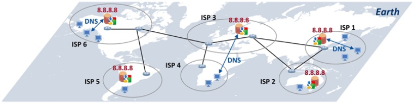- Anycast DNS에서는, DNS 질의가 하나의 특정 DNS가 아닌 다른 DNS의 네트워크로 향하며, 가장 가까우면서 가용한 DNS로 질의를 보냄