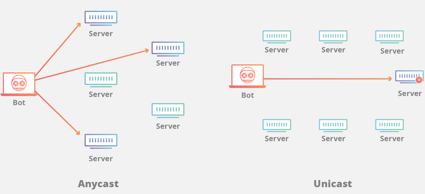 - Anycast 네트워크는 특정 IP 주소로의 요청에 대해 다수의 서버가 응답하므로, 한 대의 서버를 압도할 수 있는 수천 개의 요청이 다수의 서버에 나눠지는 것