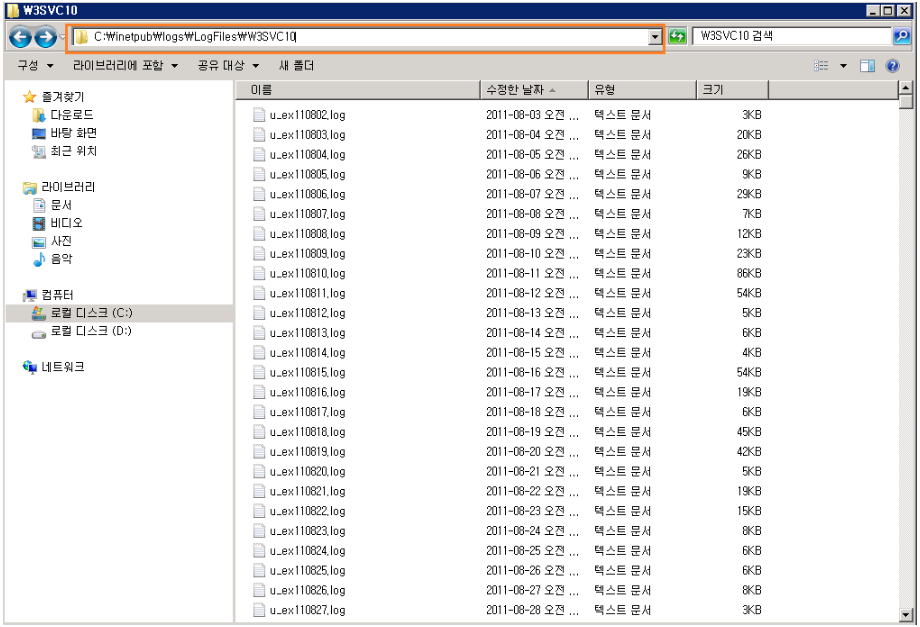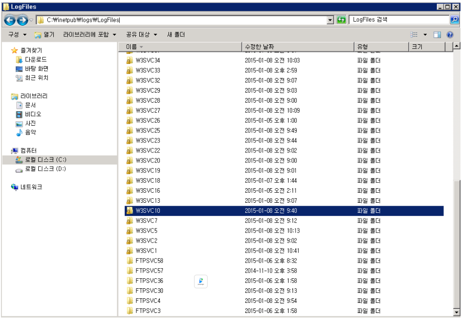 - 특정 폴더로 들어가보면 W3SVC10 이란 폴더에 들어오니, 로그 파일이 상당히 많음
