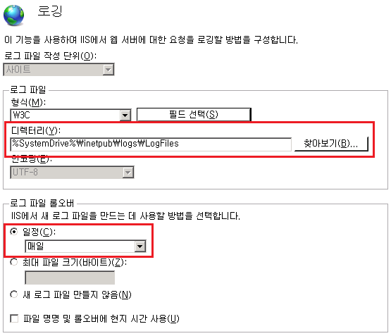 - 로깅 페이지 내용을 보니 매일 로그를 %SystemDrive%\inetpub\logs\LogFiles 폴더에 쌓고 있음