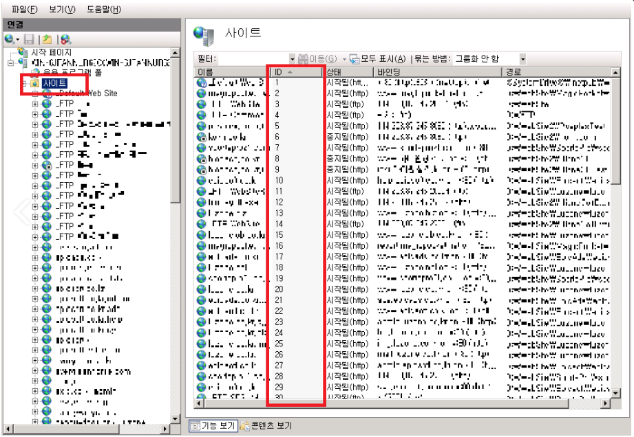 - IIS에서 좌측 상단의 사이트 트리메뉴를 선택하시면 우측에 IIS에서 관리/운영하고 있는 모든 웹사이트와 FTP사이트가 표시