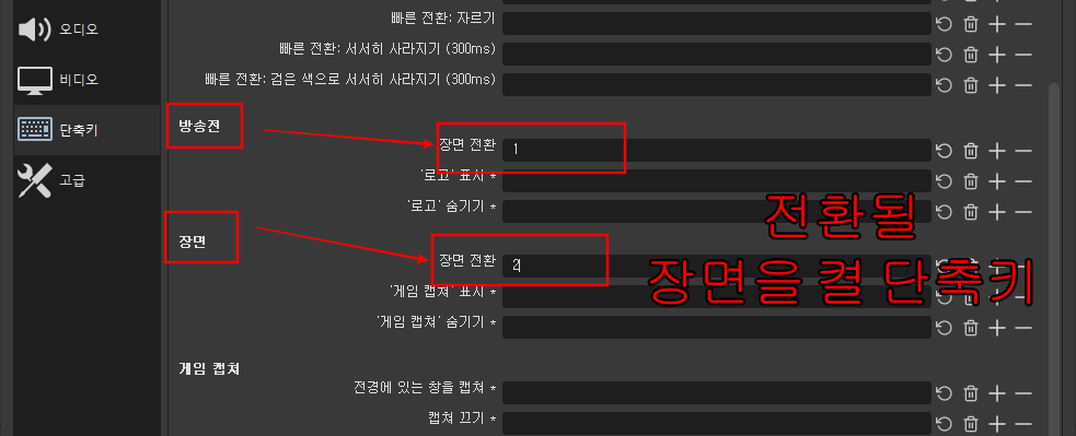 - 단축키 설정을 하려면, 먼저 사용할 장면을 미리 만들어야 함 → 만들어진 장면으로 전환할 키를 설정