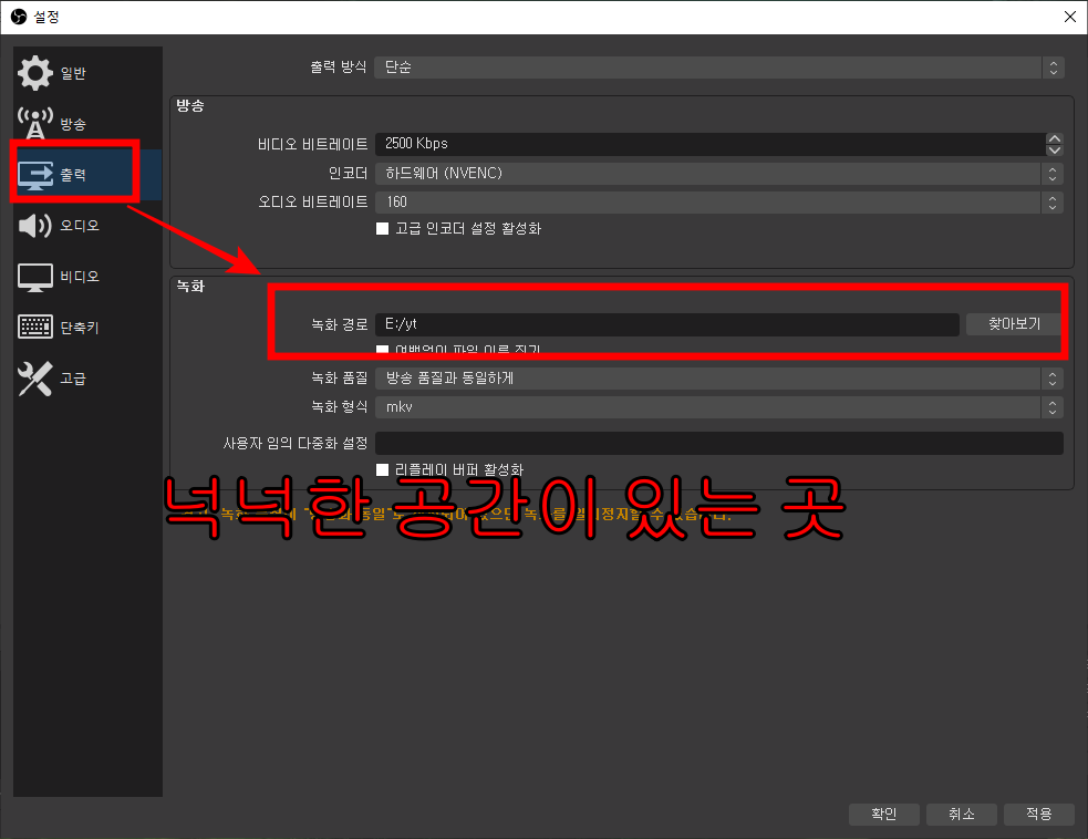 - 녹화 형식은 제일 많이 쓰는 mp4로 설정하셔도 되고, mkv 형식도 크게 문제는 없었음