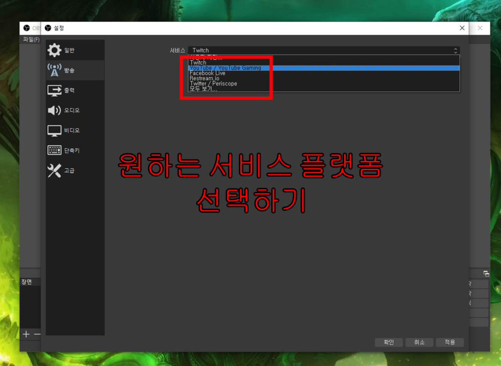 - 서비스 항목을 클릭해서 원하는 송출 서비스를 선택