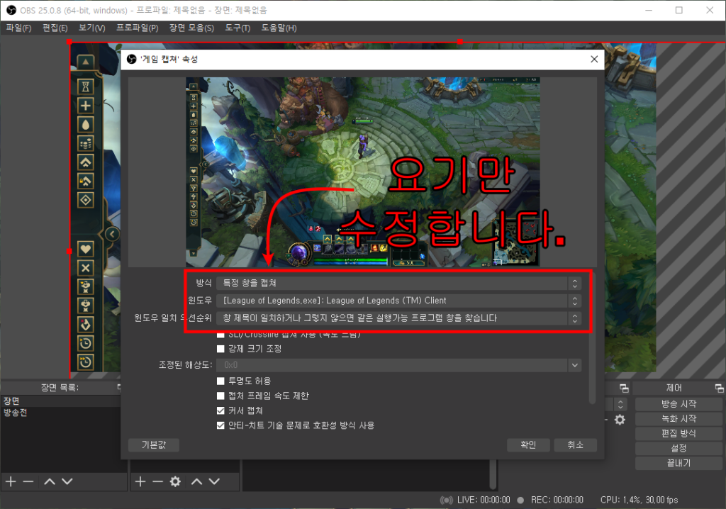 - 윈도우 → 송출할 게임의 창을 선택