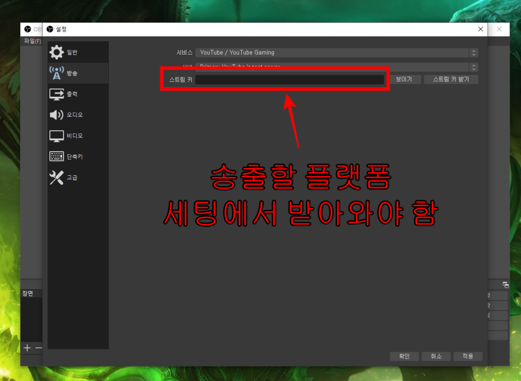 - 스트림 키를 입력 → 스트림 키는 유튜브 실시간 방송하기를 세팅하면 받을 수 있음