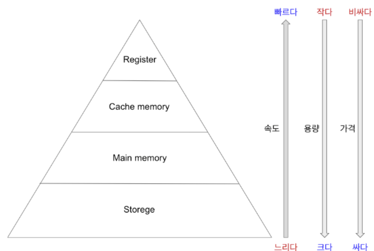 | 캐시메모리 (CPU 내) | CPU와 메모리 간의 버퍼 • CPU의 계산 결과를 캐시 • 전원을 끄면 데이터가 사라지는 형태 |