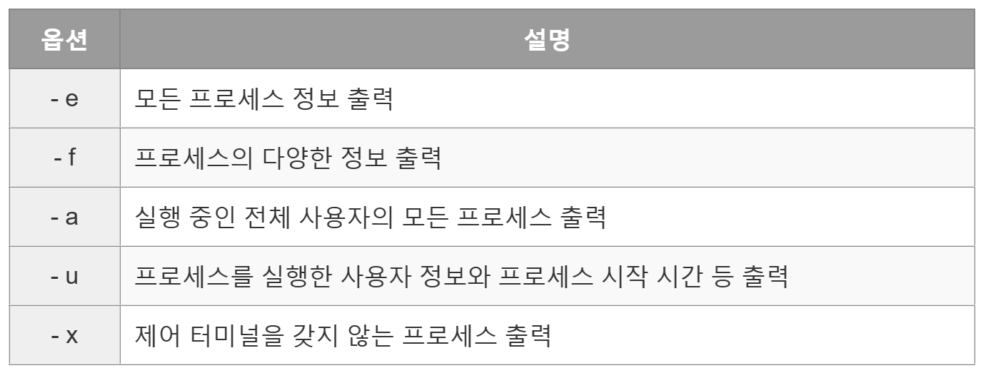 - ps 명령어 : 현재 작동하는 프로세스 목록, 프로세스의 현재 상태 출력