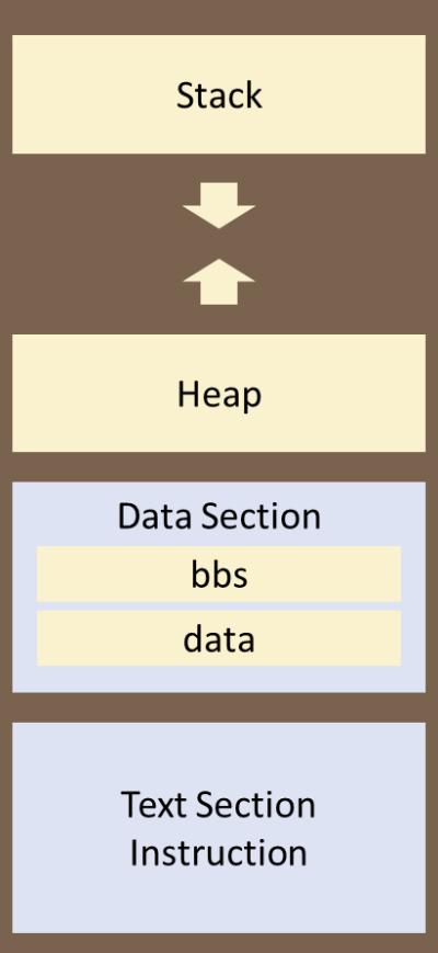 • uninitialized data section → 초기화되지 않은 전역 변수가 저장되는 영역 (BBS) - heap
