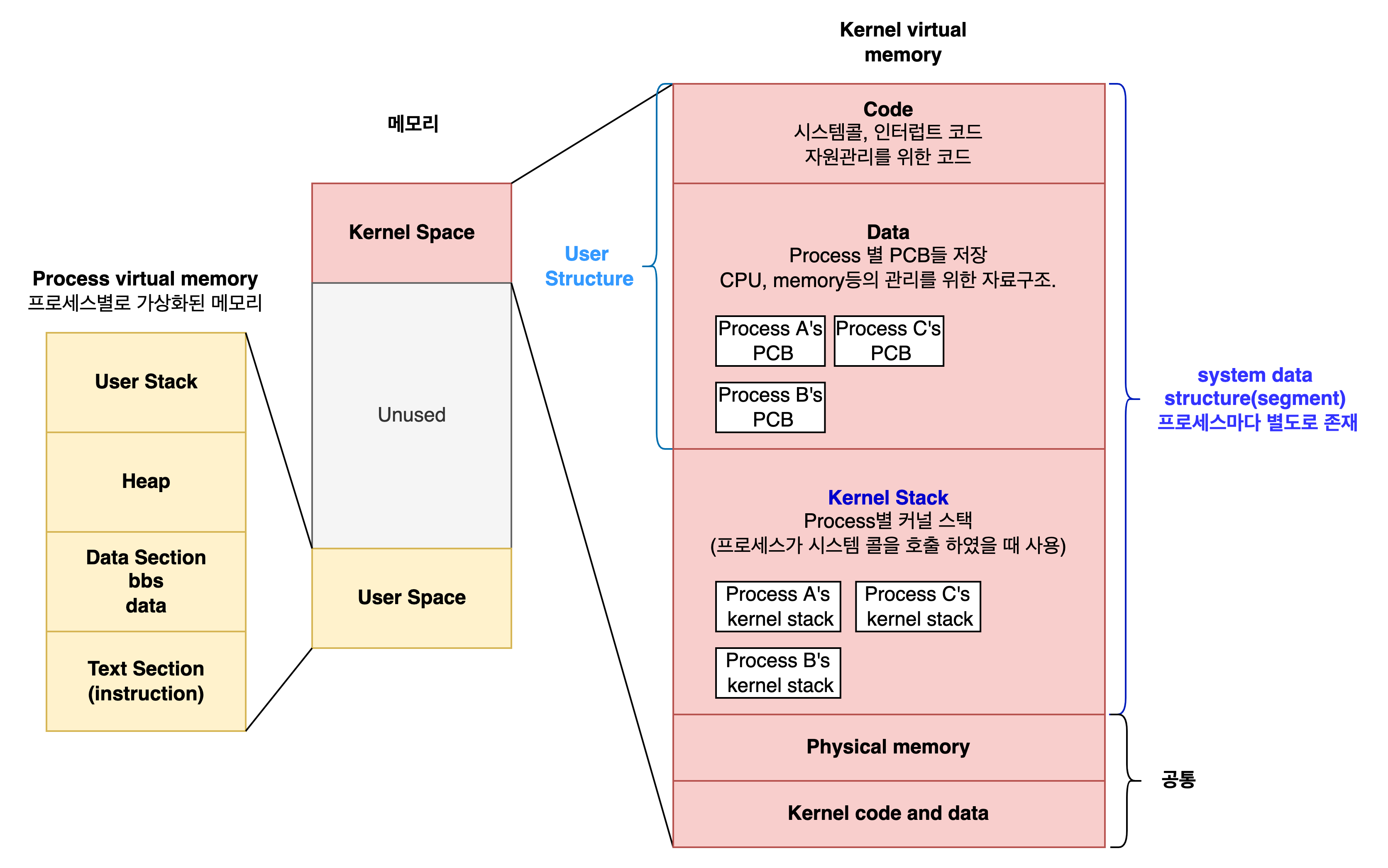 - 운영체제는 프로세스마다 고유의 가상 메모리 공간 제공