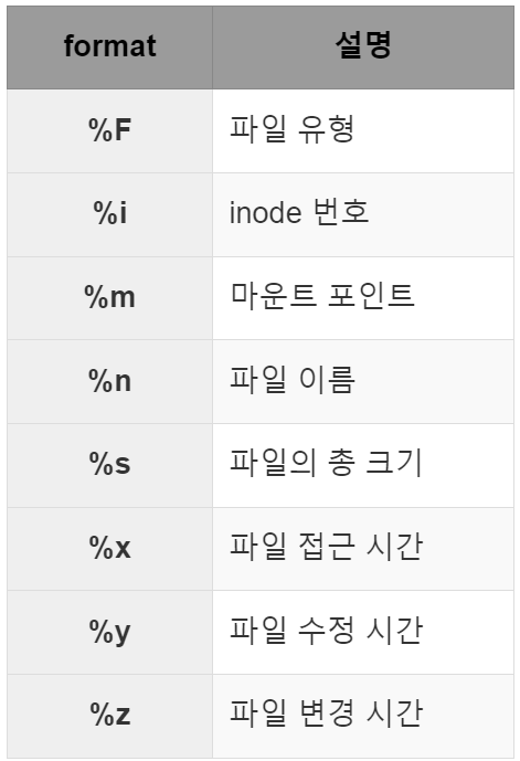 - stat 명령어 Fomat Sequence → -c 옵션을 이용해서 사용자 정의를 할 때 필요한 포맷
