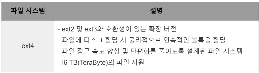 - 저널링 기술이 적용된 파일 시스템 : ext3, ext4, XFS, JFS, ResierFS 등