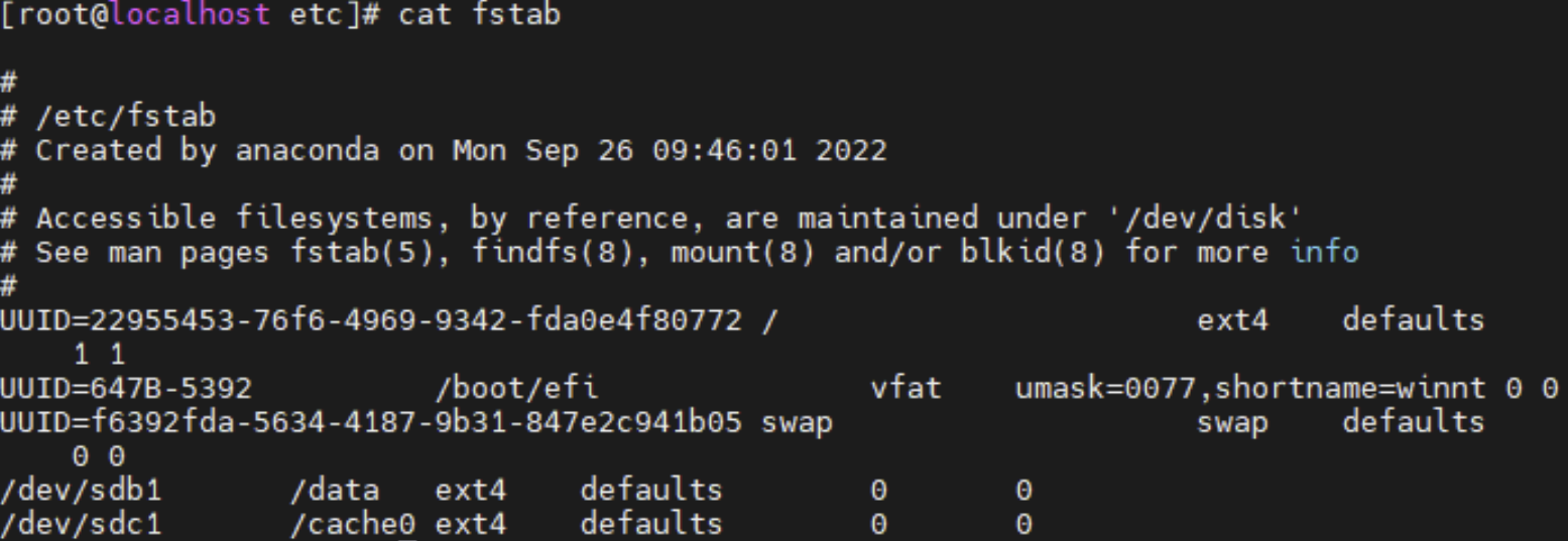 - 리눅스가 부팅되면서 어떤 파티션들을 어디에 자동으로 마운트하고, 외부 장치들에 대한 마운트를 어떻게 설정하는 파일