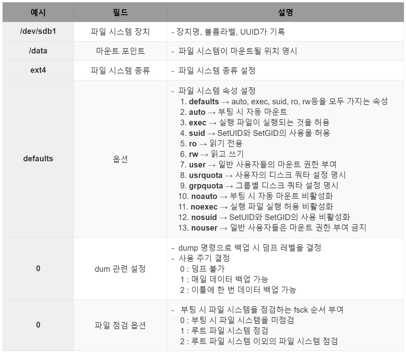 - /etc/fstab 설정 예시 및 설명