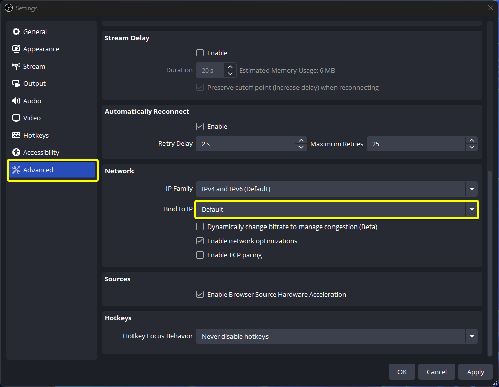 - Settings > Advanced → Network 로 이동하여 Bind to IP가 기본값으로 설정되어 있는지 확인