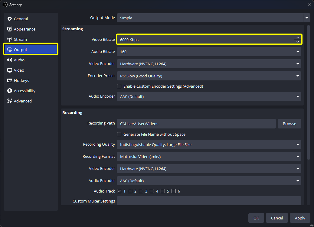 - Settings > Output으로 이동하여 비디오 비트레이트(Video Bitrate)를 낮추기