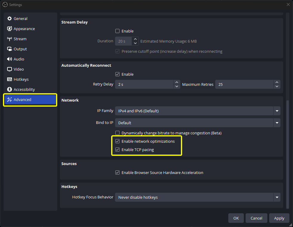- Settings > Advanced → Network로 이동하여 '네트워크 최적화 활성화(Enable network optimizations)'와 'TCP 페이싱 활성화(Enable TCP pacing)'를 선택