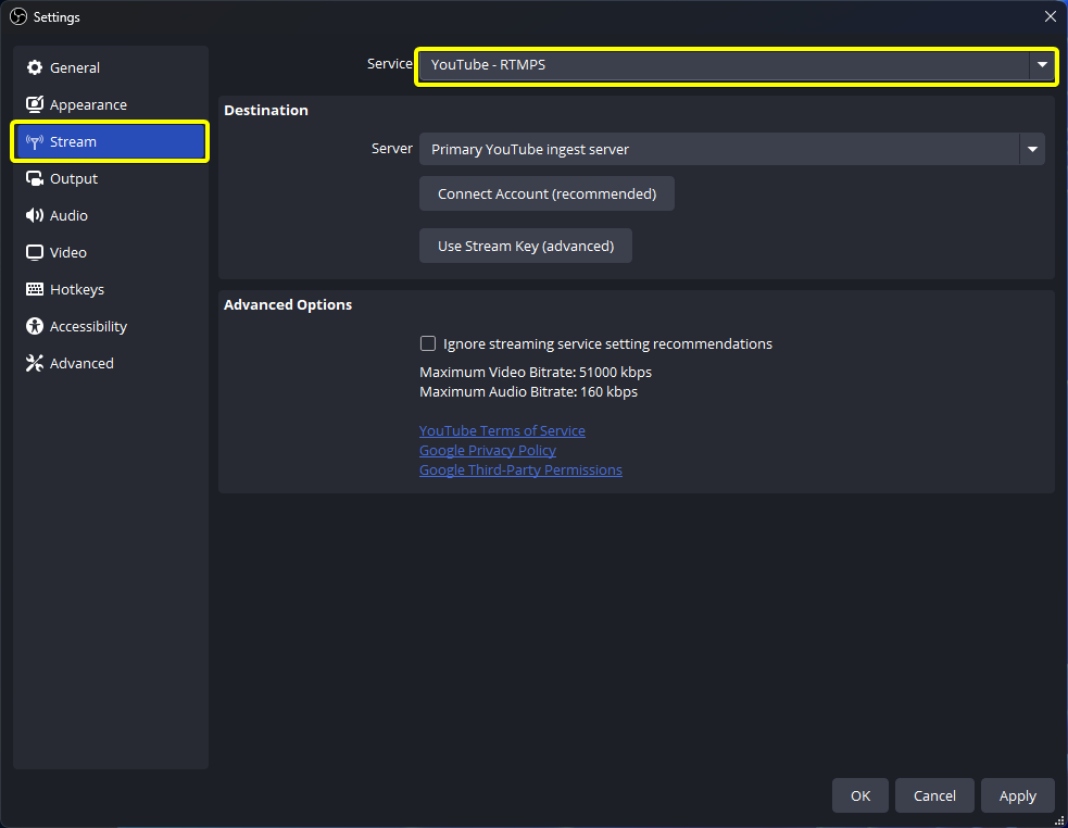 Settings > stream으로 이동하여 다른 서비스로 스트리밍(stream) 변경