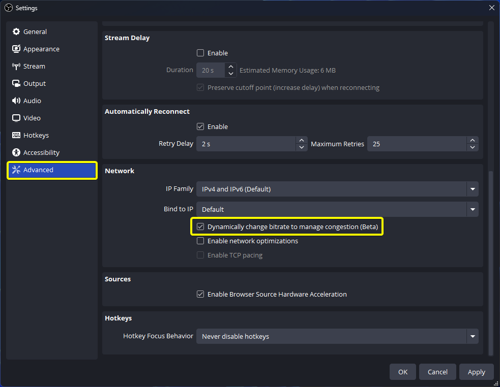 Settings > Advanced → Network로 이동하여 ‘Dynamically change bitrate to manage congestion(혼잡 관리 위해 비트레이트 동적 변경)’ 항목을 선택